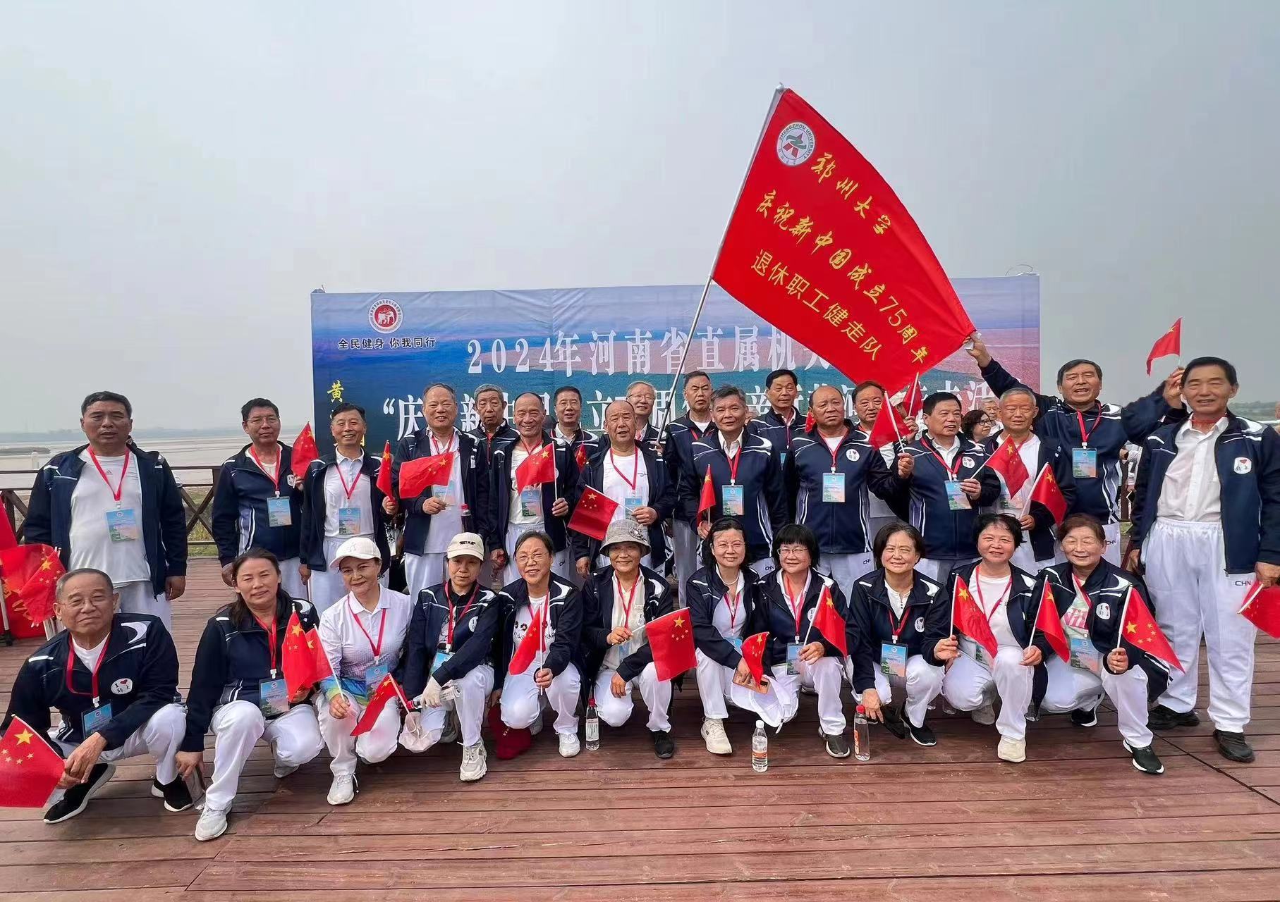 为庆祝中华人民共和国成立75周年,深入贯彻党的二十大和二十届三中全会精神,认真落实“做好离退休干部工作”的要求,丰富我校离退休职工精神文化生活,9月26日,学校组织30余位退休教职工代表参加了中共河南省委老干部局、河南省体育局举办的2024年省直机关老年人“庆祝新中国成立75周年”亲近黄河健步走活动,并荣获“优秀组织奖”。