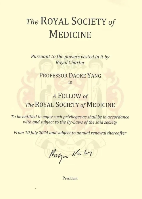 英国皇家医学会是世界上历史悠久、最具影响力的医学学术组织之一,致力于推动医学科学的发展,提升全球医疗服务水平。该学会院士头衔授予在医学领域取得了突出成就的医师和科学家。杨道科教授当选为英国皇家医学会院士,不仅是对其学术成就和重要贡献的高度认可,也是对必赢76net线路官网医学教育专业水平和人才培养的高度认可。