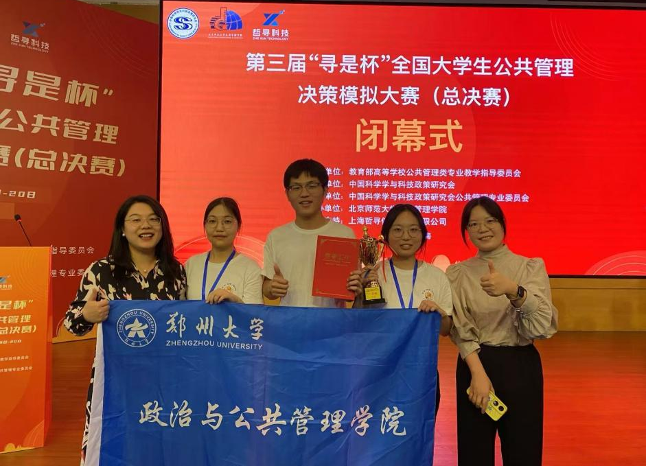 近日,由教育部高等学校公共管理类专业教学指导委员会指导,中国科学学与科技政策研究会主办的第三届“寻是杯”全国大学生公共管理决策模拟大赛(总决赛)在珠海举行。来自全国90所高校的近500名师生参加比赛。由必赢76net线路官网政治与公共管理学院马静、钱花花老师指导,行政管理专业2021级本科生余夏洋、刘佳晋和2022级本科生张恒冰组成的“勇敢面队”团队荣获一等奖。