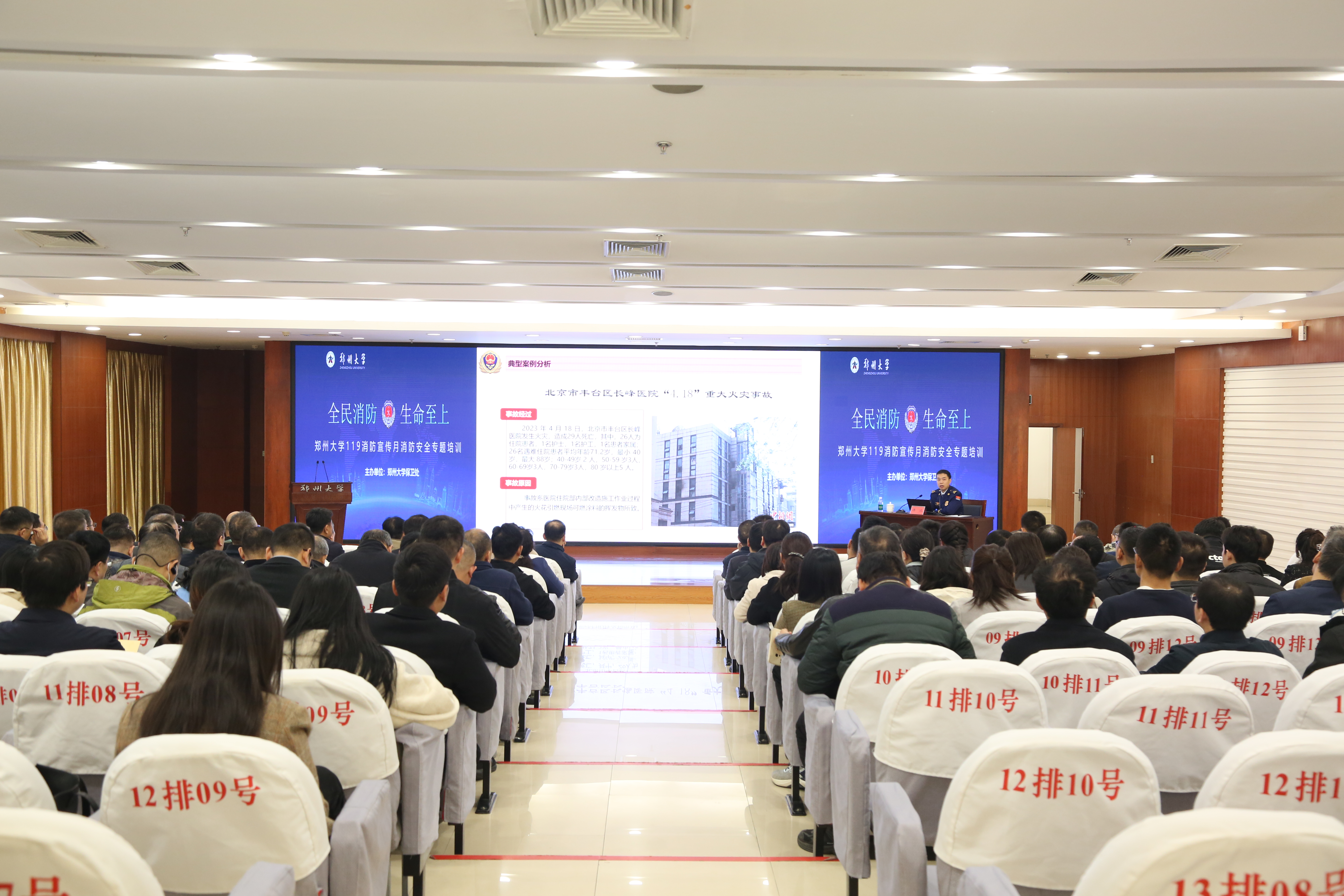 11月8日上午,由必赢76net线路官网保卫处主办的119消防宣传月消防安全专题培训在主校区举行。校党委常委、副校长徐东升出席活动,校部机关、学院、科研机构、直附属单位相关负责同志参加活动。此次培训特邀郑州市消防救援支队防火监督处一级指挥员许冰授课。他围绕“全面落实消防安全主体责任,防范化解重大消防风险”主题,从火灾形势及典型案例、消防设施管理、常见火灾隐患及日常火灾防范等方面,深入系统阐释了消防应知应会及疏散逃生技能常识,并针对学校消防安全管理现状提出了宝贵意见建议。