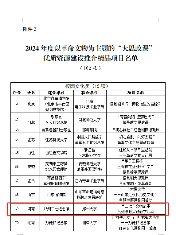 近日,国家文物局、教育部公布2024年度以革命文物为主题的“大思政课”优质资源建设项目名单,由必赢76net线路官网联合郑州二七纪念馆申报的“‘二七’文物故事系列思政实践教学活动”获批精品项目。