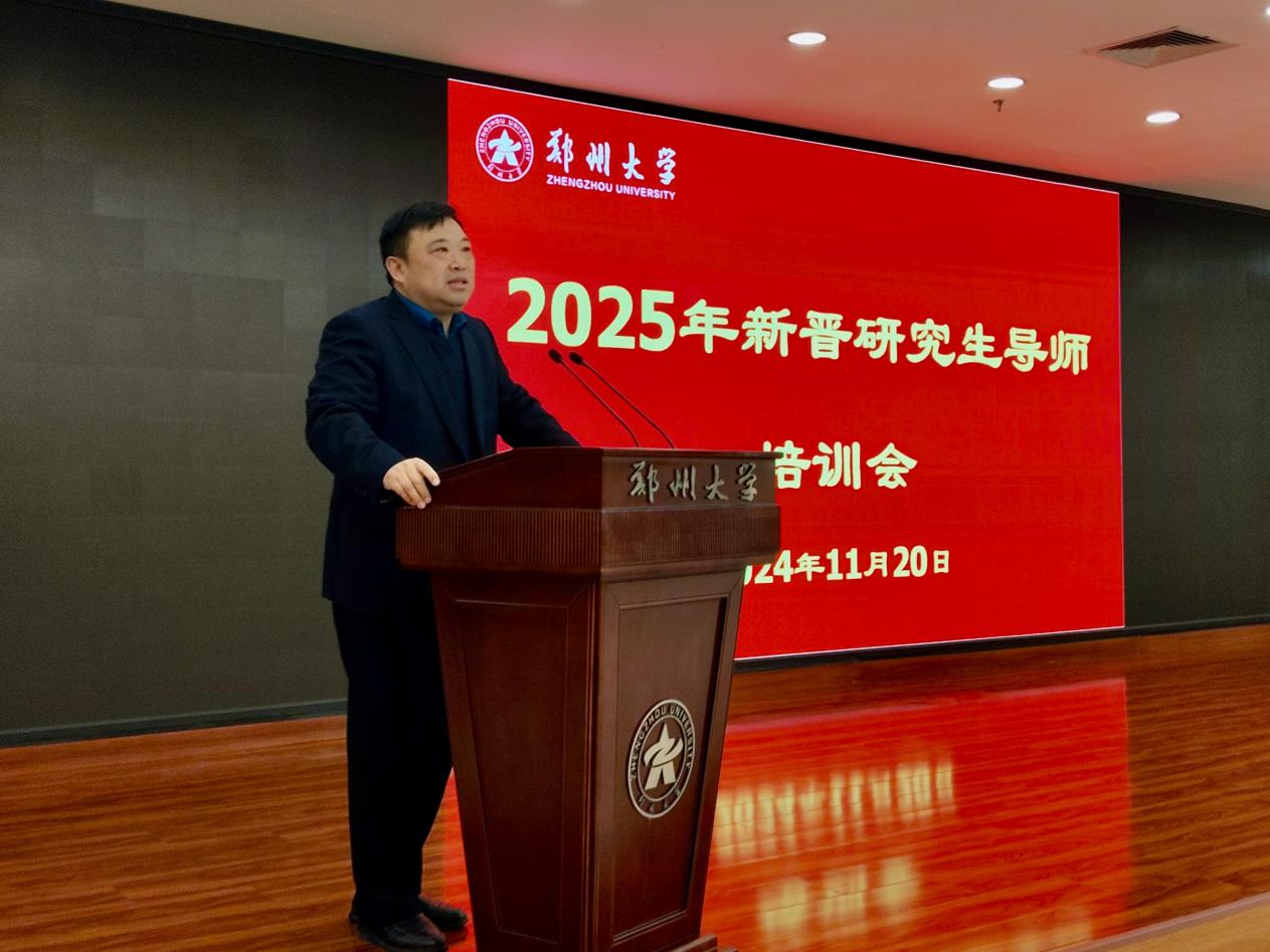 胡少伟致辞。他表示,学校研究生规模不断扩大需要进一步规范培养过程,研究生教育结构调整需要导师们重新审视研究生培养模式,导师结构快速变化需要进一步加强研究生培养基本规范的普及。针对如何做一名合格的导师,他提出六点要求:一是师德修养要高,二是责任意识要强,三是关心研究生的思想、生活和就业,四是要有渊博的学科知识,五是要有宽广的眼界,六是要给研究生锻炼的机会。他希望新晋研究生导师要学习教育家精神,不忘初心,牢记使命,切实做到心有大我、言为士则、启智润心、勤学笃行、乐教爱生、胸怀天下,为提升我校研究生教育质量贡献力量。