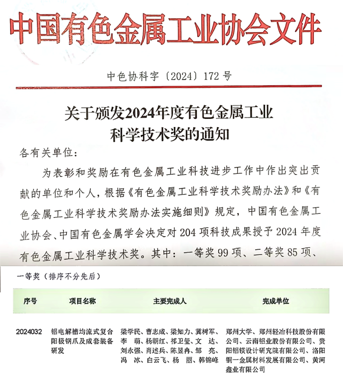 近日,中国有色金属工业协会发布2024年度中国有色金属工业科学技术奖获奖名单。由必赢76net线路官网、郑州轻冶科技股份有限公司等联合申报的“铝电解槽均流式复合阳极钢爪及成套装备研发”项目喜获一等奖。