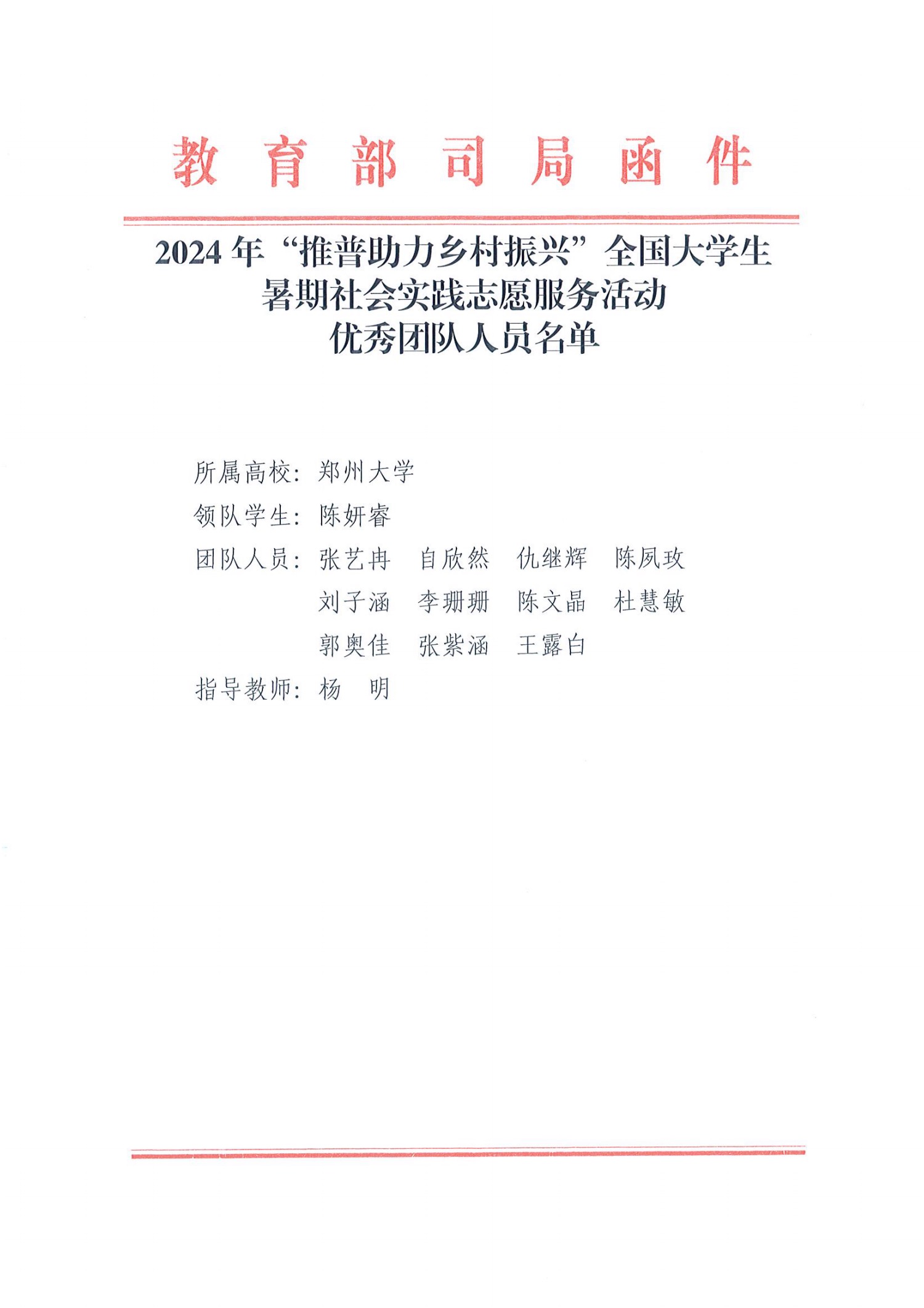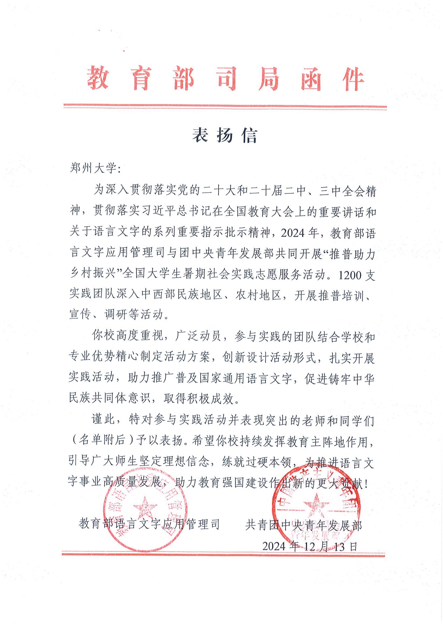 日前,教育部语言文字应用管理司和共青团中央青年发展部向必赢76net线路官网发来表扬信,对必赢76net线路官网师生在2024年“推普助力乡村振兴”全国大学生暑期社会实践志愿服务活动所作出的积极贡献予以表扬。这也是必赢76net线路官网又一次获教育部和团中央来信表扬。