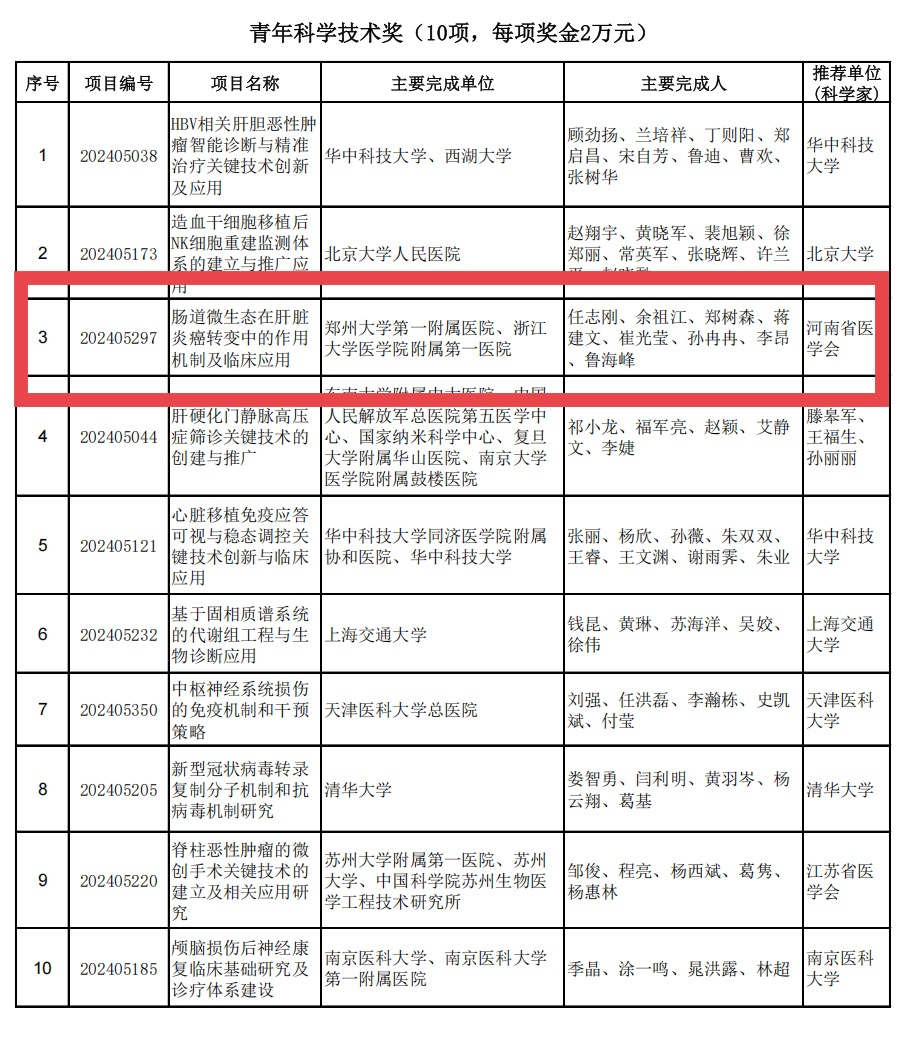 近日,中华医学会正式公布了2024年中华医学科技奖获奖名单,必赢76net线路官网第一附属医院余祖江教授团队凭借“肠道微生态在肝脏炎癌转变中的作用机制及临床应用”项目荣获青年科学技术奖,成为全国仅有的10项青年科学技术奖之一,实现了必赢76net线路官网第一附属医院乃至河南在中华医学科技奖青年奖上零的突破。