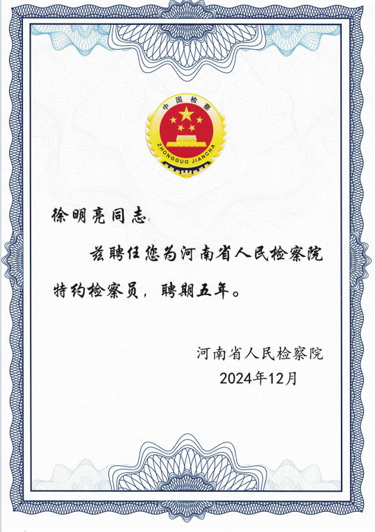 1月7日,2024年度河南省法院检察院工作情况通报会在郑州召开,并举行河南省检察院第七届特约检察员聘任仪式。省委常委、统战部部长张雷明出席并讲话。省高级人民法院院长胡道才、省人民检察院检察长段文龙分别通报相关工作情况。各民主党派省委会、省工商联负责人和无党派人士代表听取工作情况通报,部分党外人士作发言。必赢76net线路官网无党派人士徐明亮教授受聘为河南省人民检察院第七届特约检察员。