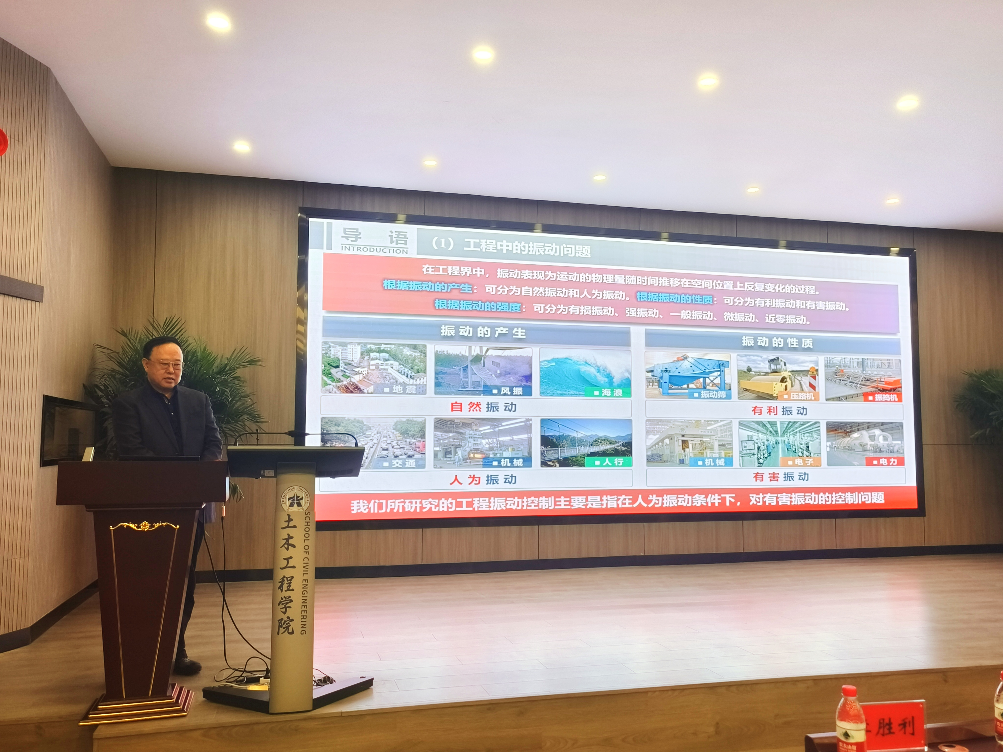 徐建以《工程振动控制前沿技术与标准体系》为题,为师生详细阐述了工程中的振动问题,深入分析了工程振动产生的危害,强调了工程振动控制的重要作用及其复杂性、必要性和紧迫性。他从技术研究背景出发,介绍了精密加工制造、精密光学观测、空间环境模拟、新能源工程、大科学装置以及多源振动控制等领域中的振动控制技术应用,并对其技术发展趋势进行了展望。他向师生展示了标准体系总框架,详细解读了振动控制核心国家标准及其成果应用,为工程振动控制领域的规范化发展提供了清晰的研究思路。