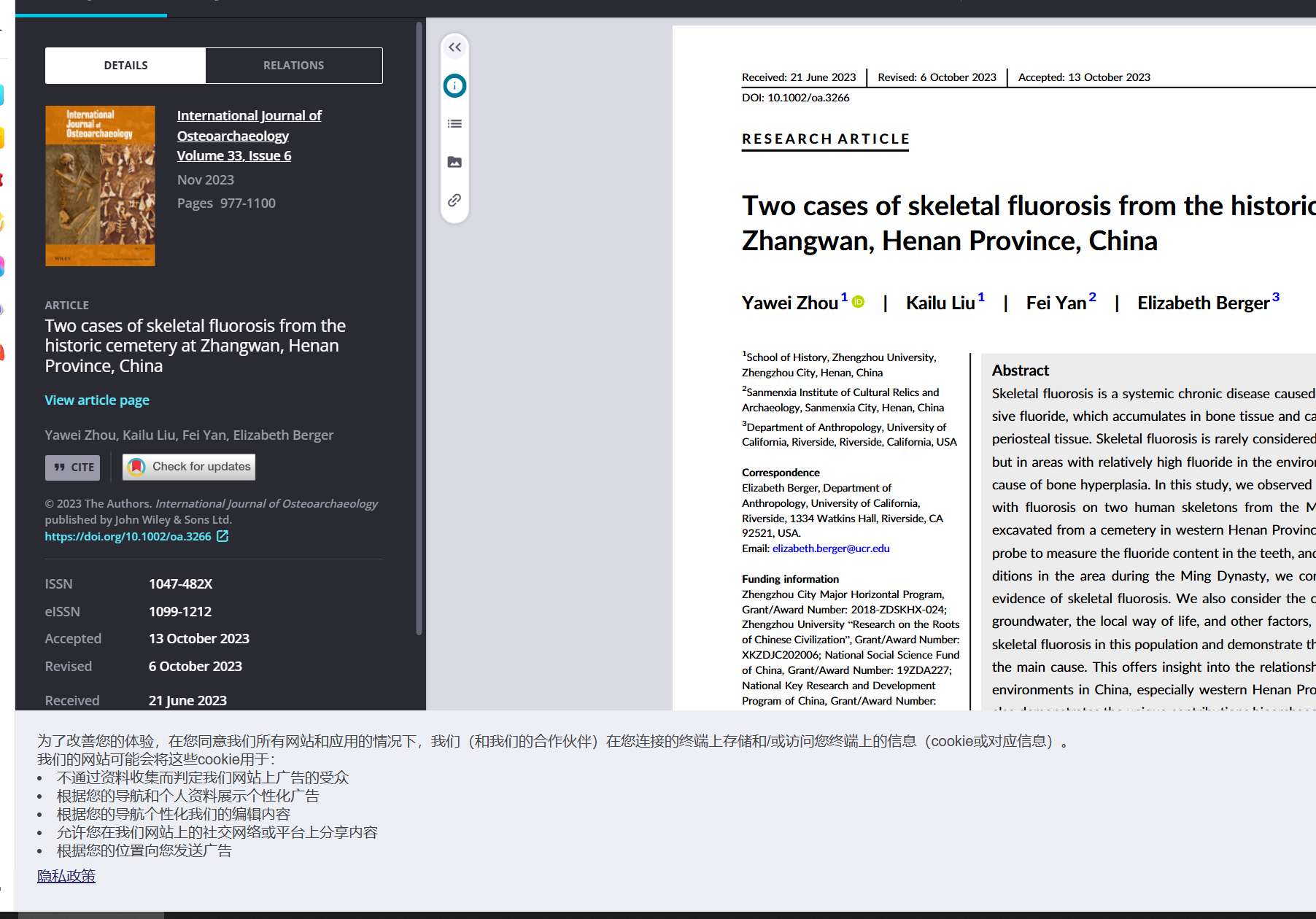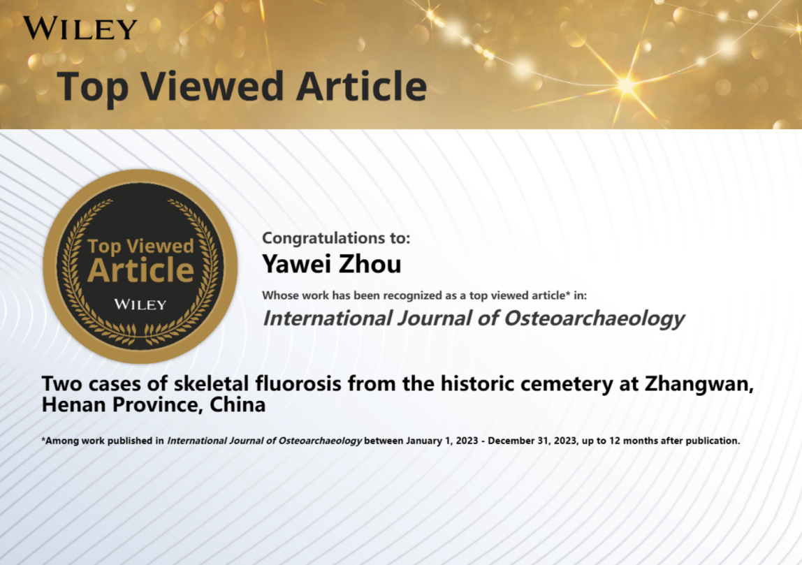 近日,必赢76net线路官网“中华源”考古实验室团队在国际期刊《国际骨质考古学杂志》(International Journal of Osteoarchaeology)上发表的科研论文“Two cases of skeletal fluorosis from the historic cemetery at Zhangwan, Henan Province, China”名列Wiley系列杂志2024年最高阅读量前10%,荣获Wiley杂志高阅读量作者奖。该论文由我校“中华源”考古实验室周亚威教授团队、美国加州大学河滨分校人类学系Elizabeth Berger博士和三门峡市仰韶文化研究中心燕飞馆员合作完成。