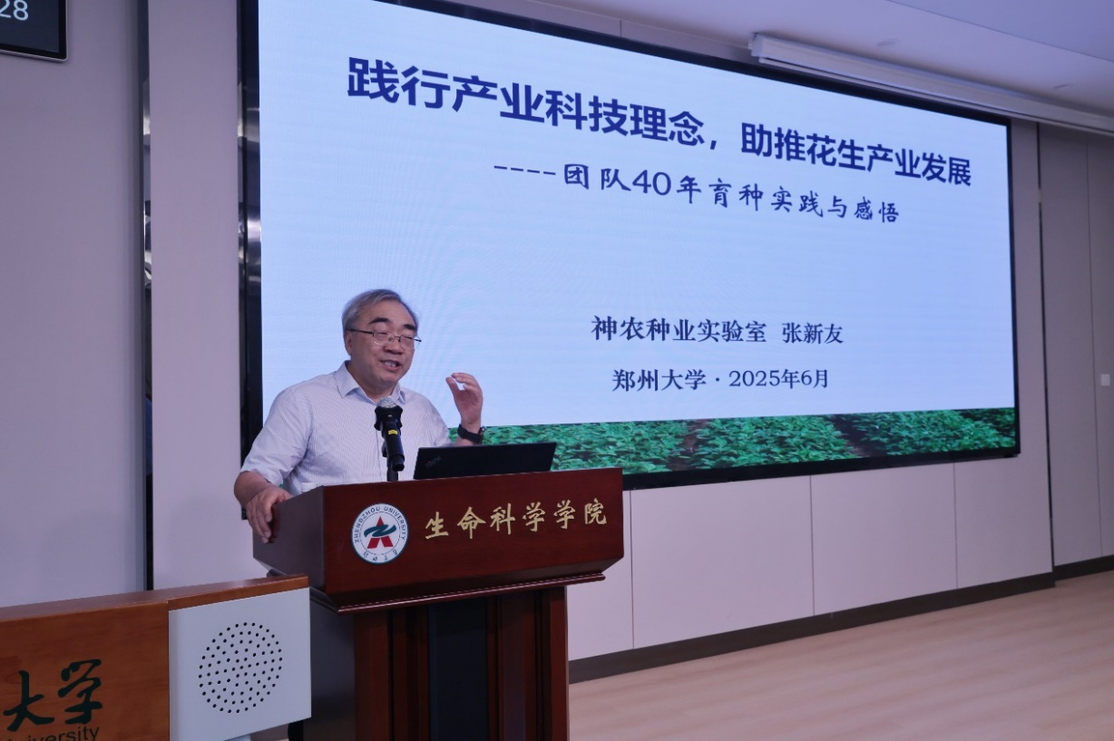 张新友院士作题为《践行产业科技理念,助推花生产业发展》的学术报告。报告中,张院士结合自身科研积淀与团队深耕花生育种领域四十载的斐然成果,以扎根田间的鲜活案例生动诠释“把论文写在大地上”的科学家精神。报告深入剖析农业前沿创新科技,极大激发了同学们投身农业科研的热情。