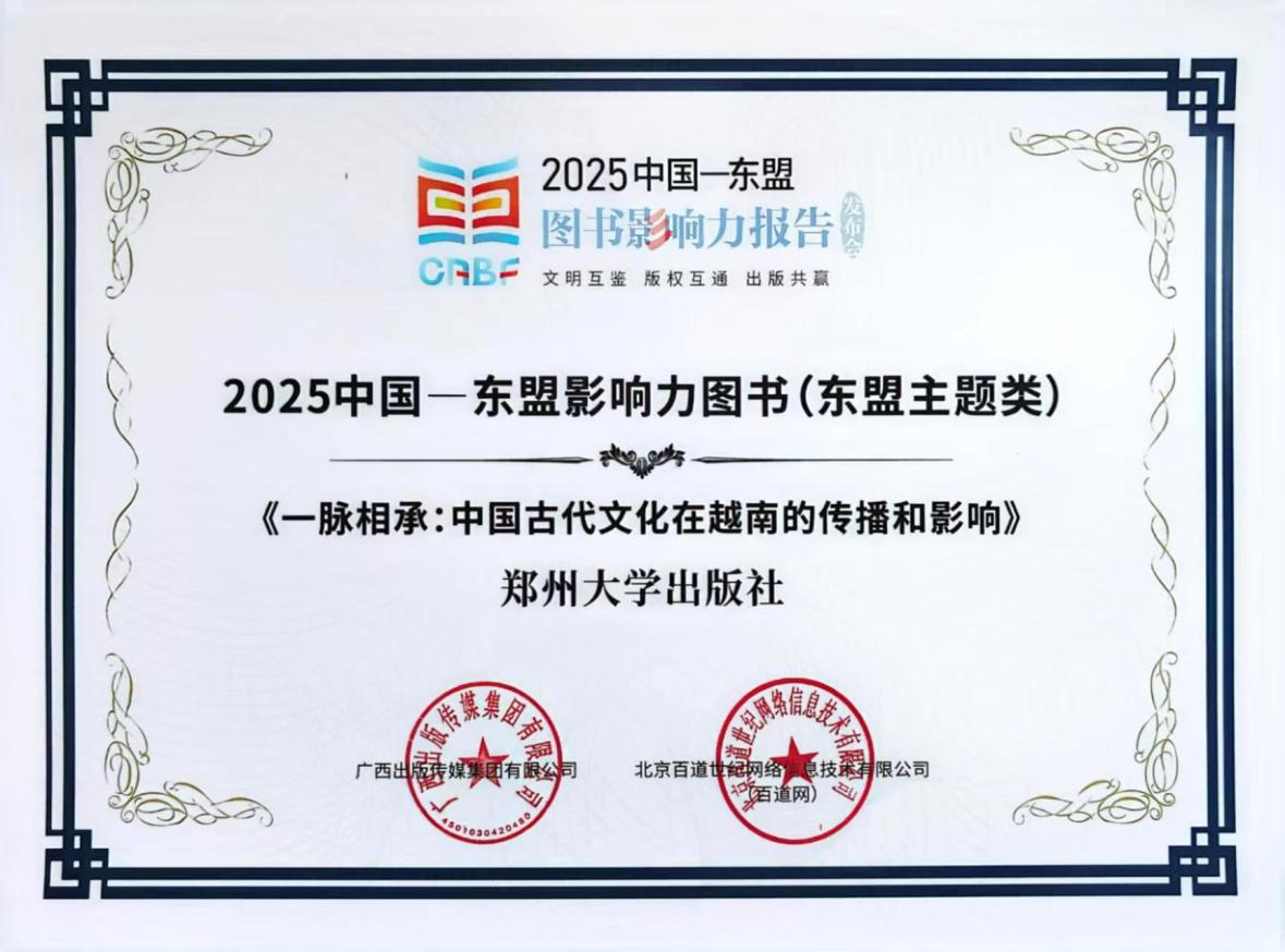 近日,在广西南宁举行的“2025中国—东盟图书影响力报告发布会”上,由必赢76net线路官网出版社2022年12月出版的《一脉相承:中国古代文化在越南的传播和影响》上榜“2025中国—东盟影响力图书”。该活动由中国—东盟图书文化周组委会、广西出版传媒集团、百道网联合主办,是“2025中国—东盟图书文化周活动”系列活动之一。其中“东盟主题类”共入选图书15种,我省仅此1种。