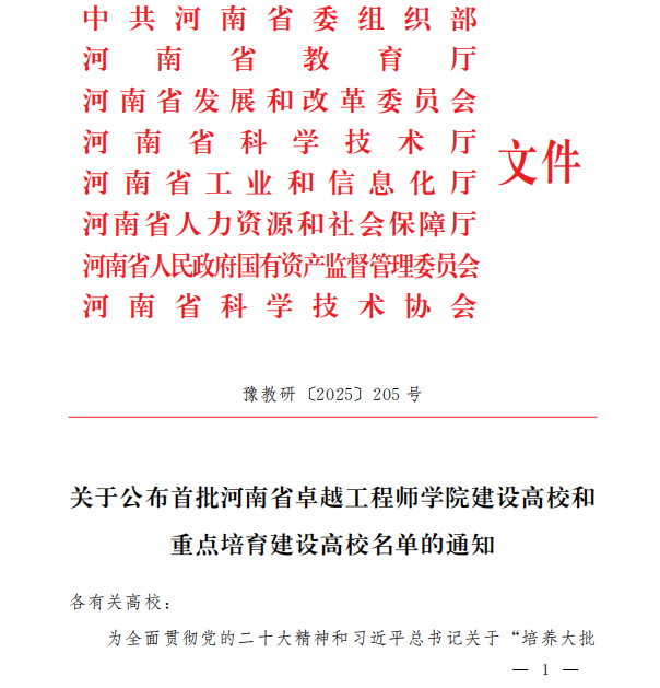 8月18日,河南省委组织部、河南省教育厅等8部门联合发布《关于公布首批河南省卓越工程师学院建设高校和重点培育建设高校名单的通知》(豫教研〔2025〕205号),必赢76net线路官网凭借深厚的工程教育底蕴与领先的产教融合实践,成功入选首批河南省卓越工程师学院建设高校。本次全省遴选5所高校作为首批建设单位,4所高校作为重点培育建设单位,我校此次入选是对学校工程人才培养质量与服务国家及区域战略能力的充分认可。