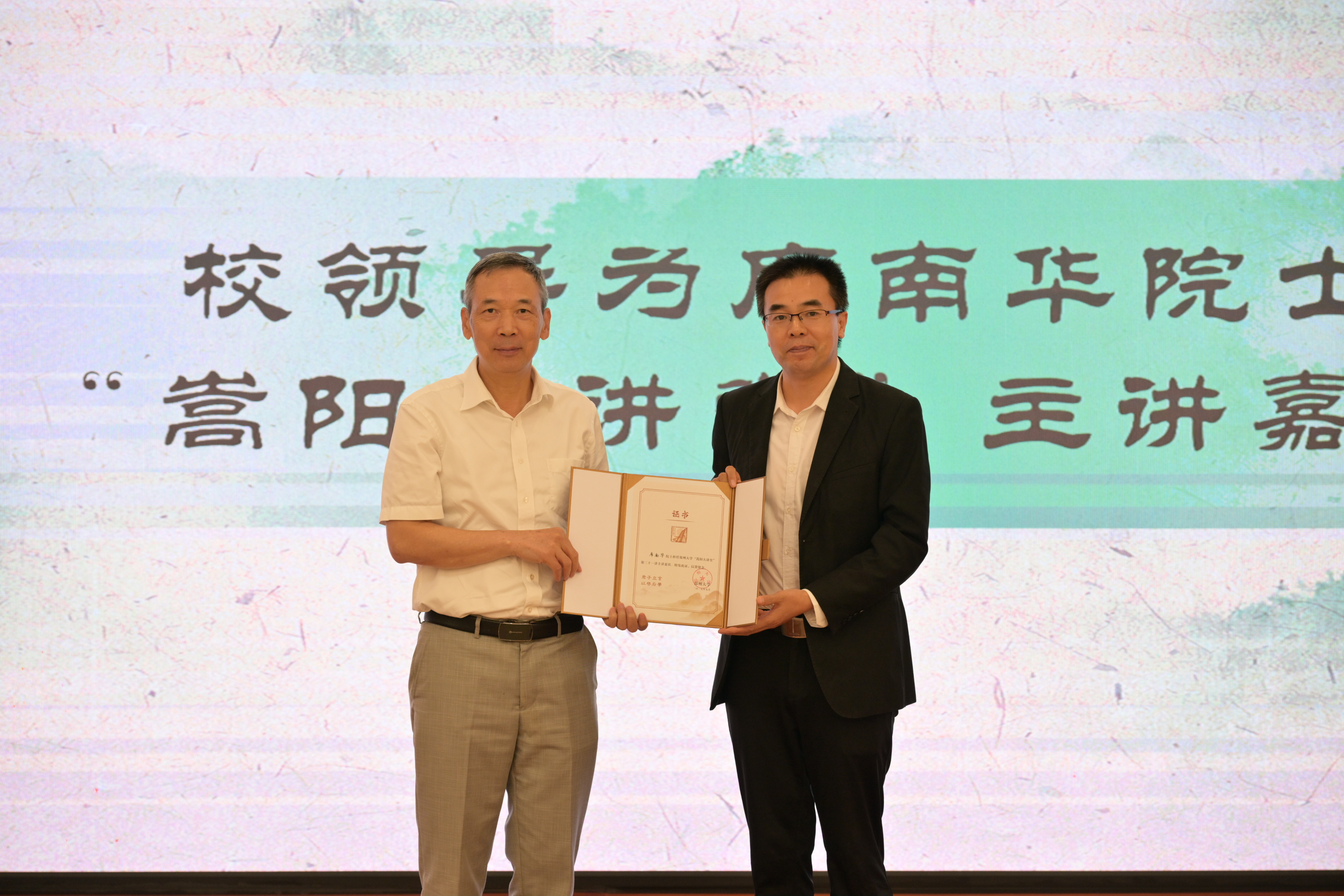 单崇新为中国科学院数学与系统科学研究院研究员、中国科学院院士席南华颁发“嵩阳大讲堂”主讲嘉宾证书。