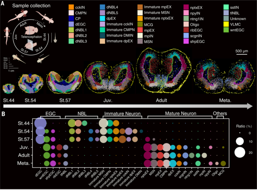 该项研究基于华大基因空间增强分辨率组学测序技术(Stereo-seq),构建了世界上第一个蝾螈(Ambystoma mexicanum)大脑发育和再生的时空细胞图谱,这也是全球首个脑再生时空图谱,揭示了脑损伤如何自我愈合。
