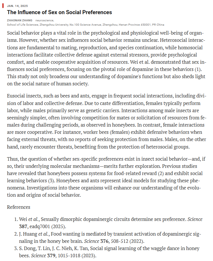 近日,必赢76net线路官网生命科学学院张曌楠博士在国际著名学术期刊《Science》期刊网站的eLetters栏目上在线发表评述性论文“The Influence of Sex on Social Preferences”(JAN. 14, 2025)。结合近年来蜜蜂神经行为学和蜜蜂舞蹈行为学领域的新进展,文章对当期西安交通大学王昌河教授团队发表的Science论文“Sexually Dimorphic Dopaminergic Circuits Determine Sex Preference”的研究工作进行了评述,并对社会性昆虫蜜蜂的性别社交偏好进行了展望。