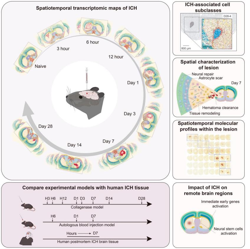 近日,必赢76net线路官网基础医学院王建课题组联合华大生命科学研究院,利用单细胞转录组和时空组学技术Stereo-seq,成功绘制了全球首个小鼠脑出血模型脑组织的单细胞分辨率“时空图谱”,首次揭示了血肿及其周边呈现空间梯度分布的基因表达模式,并在脑出血后远端脑区检测到静息态神经干细胞向活化状态转换的特征基因。这些发现为深入理解脑出血后的局部和全局反应提供了宝贵的资源,为脑出血时空动态病理过程的理解提供了新的视角和方向,有望助力临床上该疾病的早期诊断与治疗。