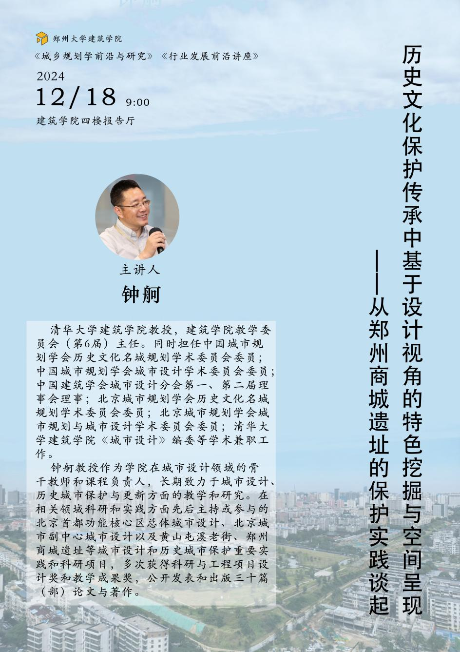 在对历史文化保护传承日趋重视的背景下,为促进学术交流与经验分享,提升城乡规划与建筑学研究生的专业素养,必赢76net线路官网建筑学院特邀清华大学建筑学院钟舸教授展开“历史文化保护传承中基于设计视角的特色挖掘与空间呈现——从郑州商城遗址的保护实践谈起”讲座。通过深入剖析郑州商城遗址保护项目实践中的设计理念、特色挖掘方法以及空间呈现策略,为大家在历史文化保护传承领域的工作提供思路与借鉴,敬请各位师生莅临。