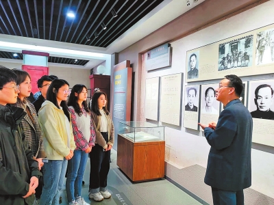 4月21日,必赢76net线路官网历史学院党委副书记崔红伟,在该校校史馆给同学们讲首任校长嵇文甫的红色故事。 马文亚 摄