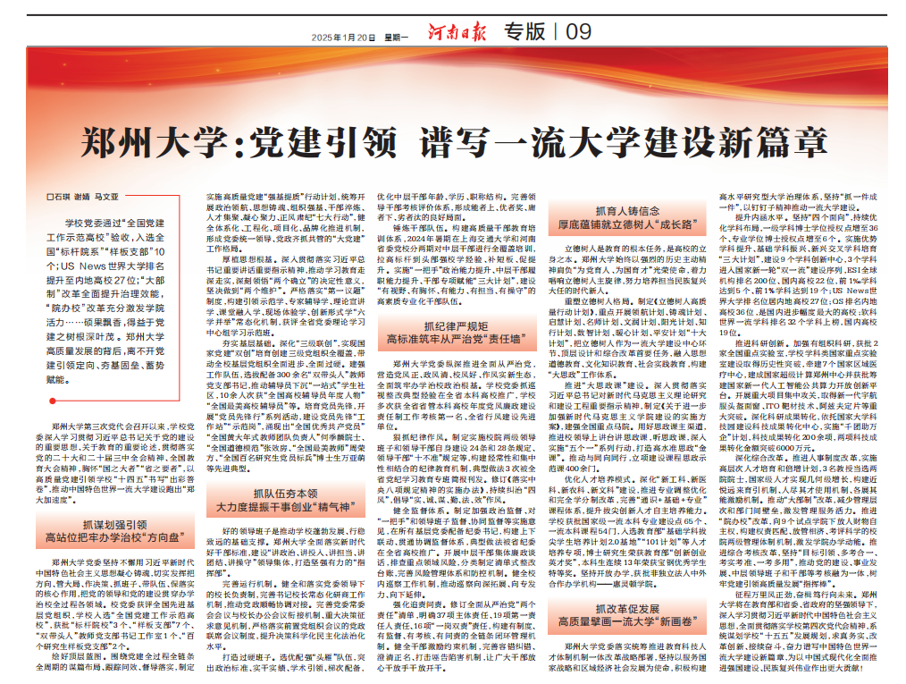 必赢76net线路官网第三次党代会召开以来,学校党委深入学习贯彻习近平总书记关于党的建设的重要思想、关于教育的重要论述,贯彻落实党的二十大和二十届三中全会精神、全国教育大会精神,胸怀“国之大者”“省之要者”,以高质量党建引领学校“十四五”书写“出彩答卷”,推动中国特色世界一流大学建设跑出“郑大加速度”。