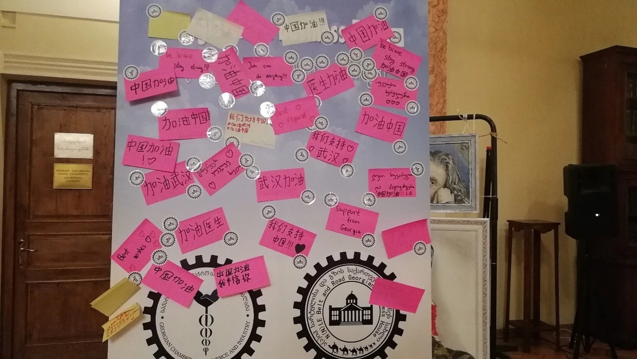 身处格鲁吉亚第比利斯自由大学孔子学院,中方院长苏国营在大使馆和汉学家协会倡议与支持下,协助举办了“我们支持中国”口罩捐赠活动。当地时间2月11日,议会图书馆专门准备了一个大厅,挂上标语、放上箱子,号召大家进行捐赠。媒体向当地居民报道中国疫情发展和物资短缺的情况。据苏院长回忆,捐赠的最后一天来的人很多,有些人哪怕只买到了一盒口罩,也进行了捐赠,同时用汉语、格鲁吉亚语写下了对中国的祝福。