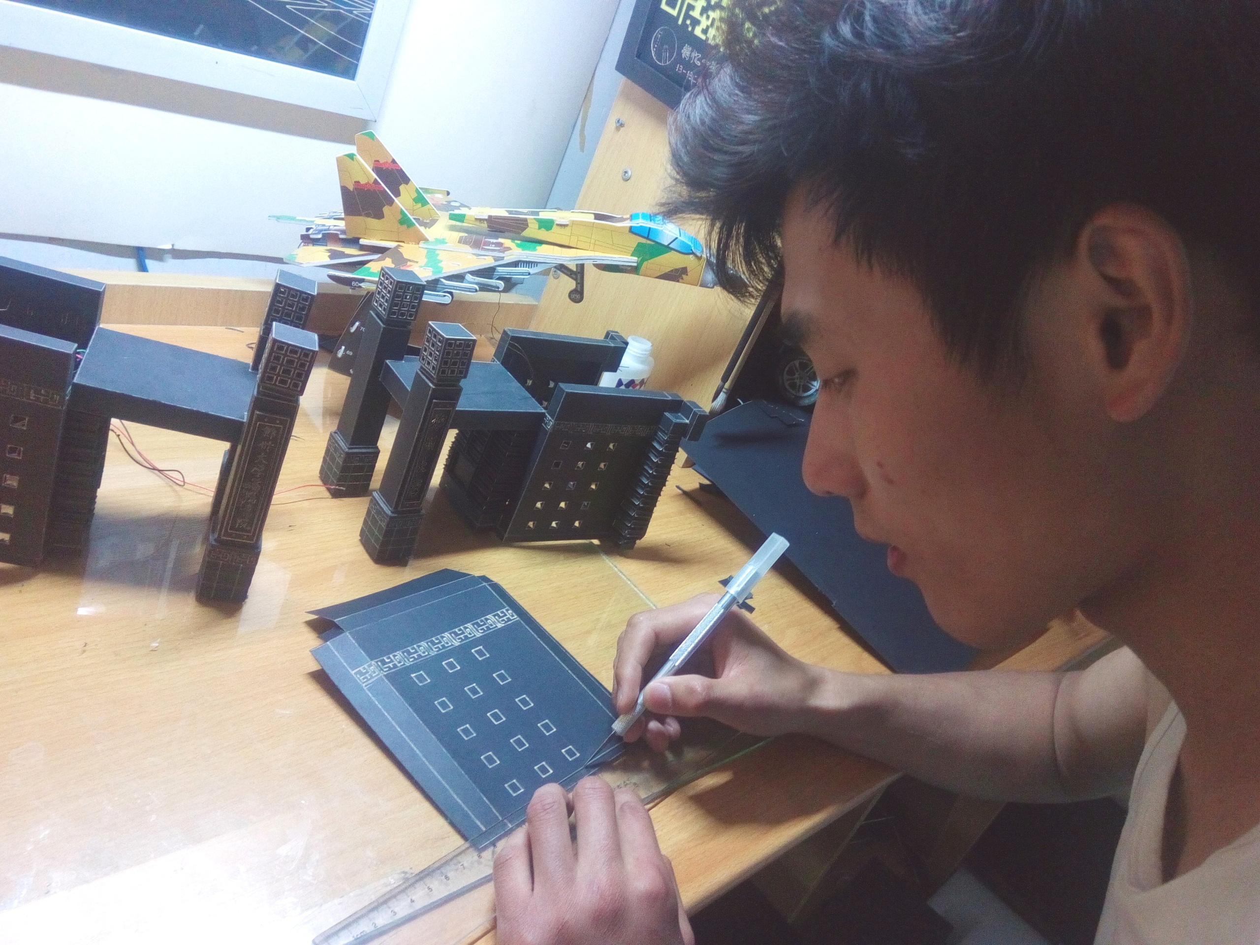 暑假期间,尹燕明耐着近40度的高温,坐在书桌前小心翼翼地起型、裁剪、沟槽、调整、粘连,力争把每一处细节做到完美。为了防止手心里的汗渍渗透纸张,他想办法借助各种工具代替手指操作,豆大的汗珠顺着额头流进眼里,不一会的功夫,衣服就湿透了。寒假时,尹燕明将未完成的作品带回了山东老家。山东的冬天阴冷潮湿,为了不让手指冻僵,他用电暖器取暖,因过于专注,腿不小心被烫伤,几块伤痕至今未消。