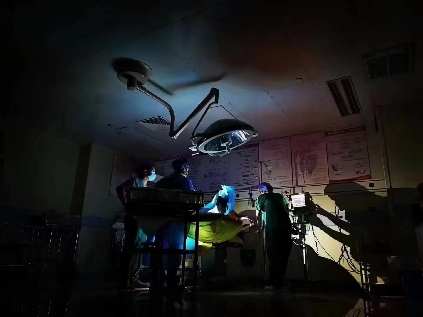 医护人员在备用灯下为产妇接生