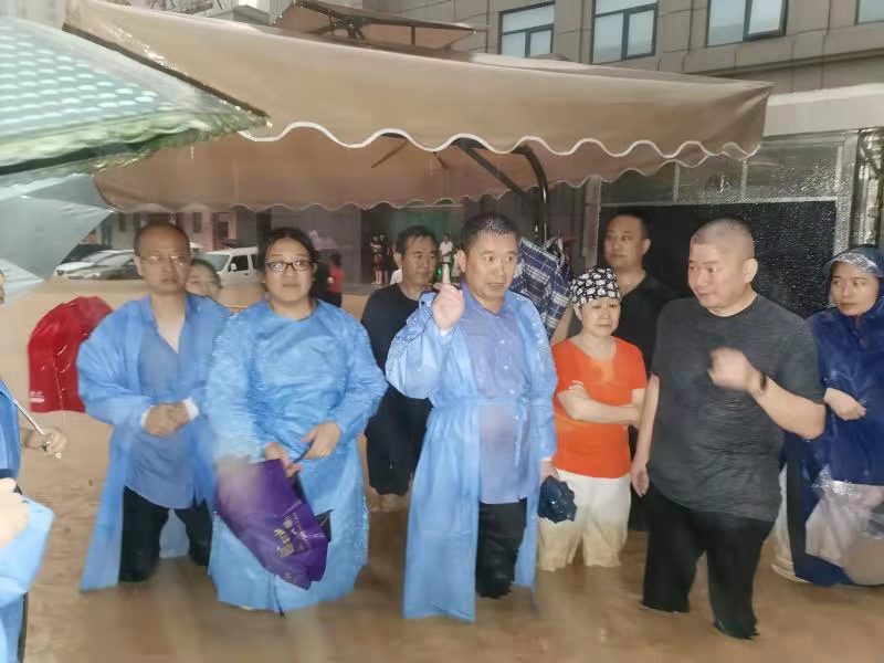 7月20日下午4点多,院党委书记吴超带领班子成员第一时间迎着风雨冲了出去。他们顾不上打伞,带领职工跳进水中搬沙袋、堵雨水、保护配电设施,投入到防汛战斗中。