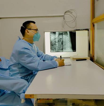 放射科没有专职医生,李杰第一天直接到岗上班。放射科仅有四台DR设备,所幸设备是国内常见的设备,李杰处理起图像以及浏览图像来得心应手。除日常工作外,李杰还需要为中资企业急诊病人提供影像检查 。由于受到带着各种口音的英语及当地语言的考验,李杰为了尽快胜任工作,早出晚归地跟当地同事们交流、看不同英文手写笔迹、背报告模板。截止2022年7月1日,李杰共出具X光英文报告2000多份;为临床医生提供影像检查咨询及会诊86人次。