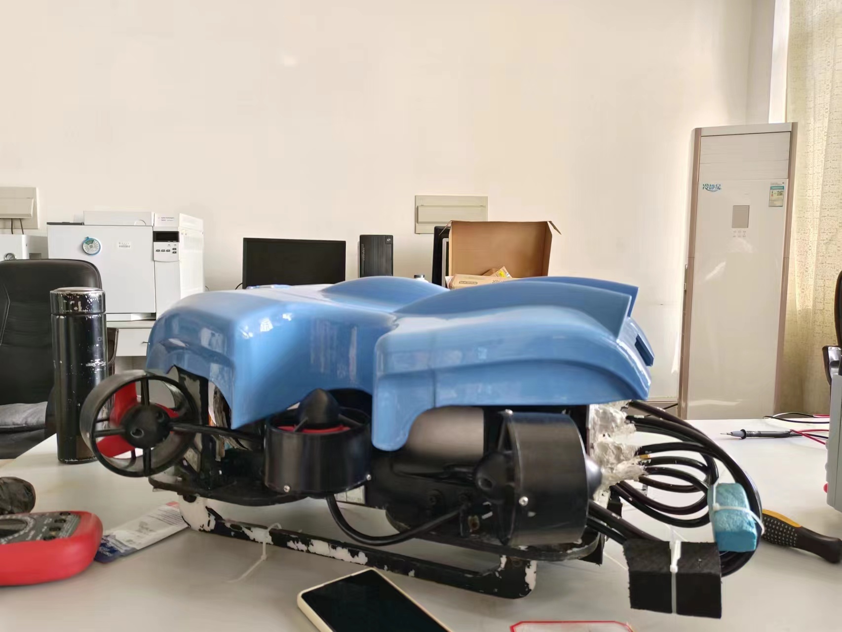 对于“小蓝”的研发,整个团队虽然在一定程度上参考了学长们的研究成果,但绝大多数内容,刘冬旭及其团队还是不断进行了新的尝试。“理论很美好,现实很残酷”,不到真正下水的那一刻,谁都无法断言项目万无一失。实践过程中问题层出不穷,重心与浮心的计算偏差、配重块与浮力块安装位置判断的失误、机器本身的防水问题……任何一个环节的出错都会导致实验结果以失败告终。