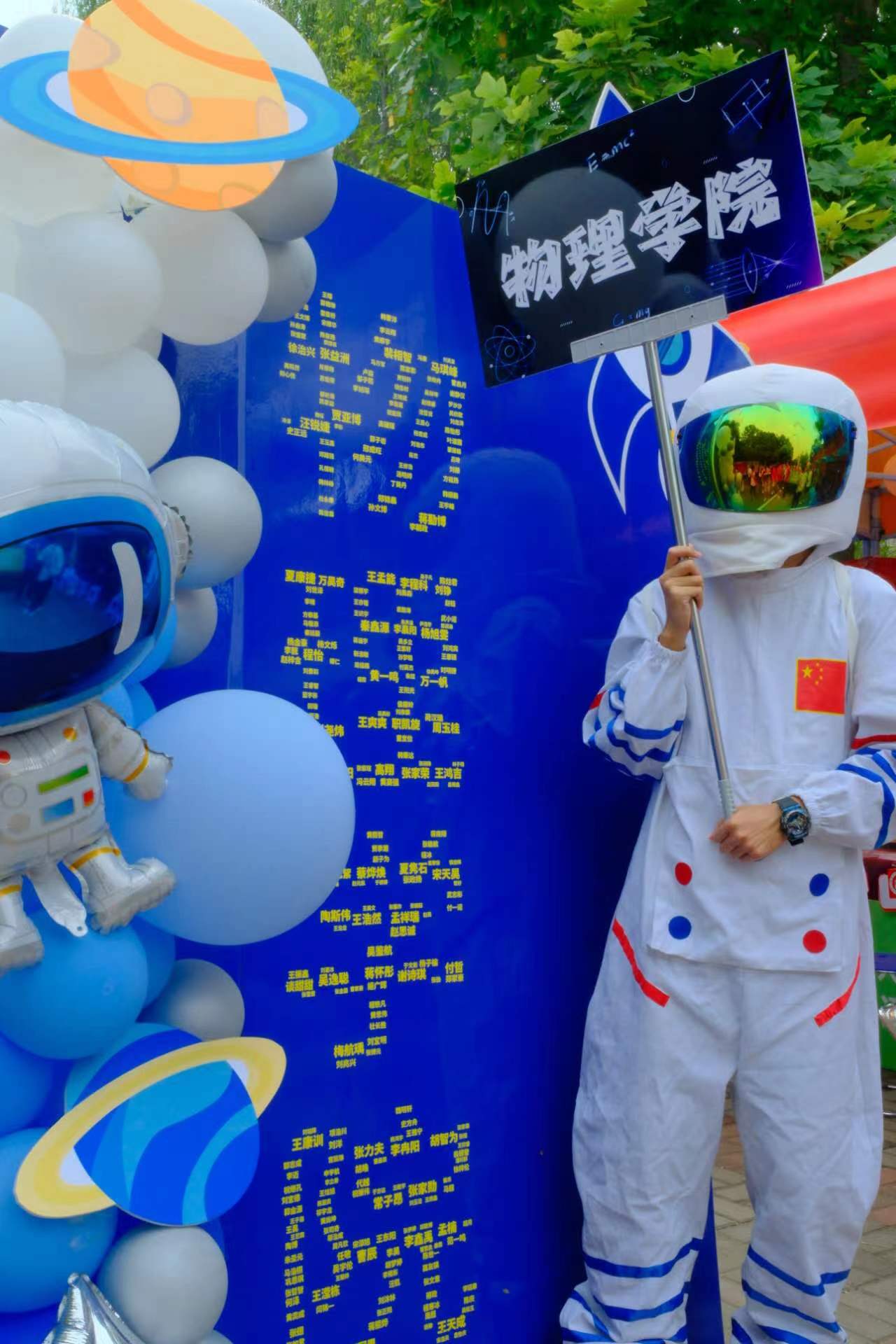 一名身着宇航服套装的同学手持牌子,他身后的背景墙上,是由所有新生姓名组成的“物理学院”四个字。新闻与传播学院门前的树上挂满了新生和家长写的愿望卡。建筑学院的迎新现场十分热闹,学生作品《大斗兽场》不仅直观地展现了院系专业的特色,还为新生起到了激励示范作用。