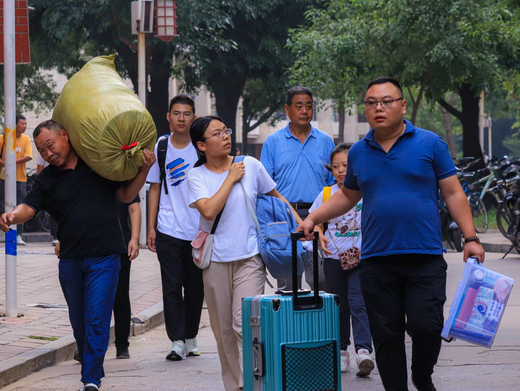 在校内各路口,特勤保安和国旗护卫队队员在引导交通,向家长指路。在迎新值班餐厅,学校延长营业时间至夜间12点,为晚上到校的新生及家长提供热乎饭菜和夜间休息场地。药学院2023级的杨雨欣家长感慨道:“我们是全家总动员送孩子上学,家长能进校我们就放心了。自己亲身体验,比听别人说要好。”