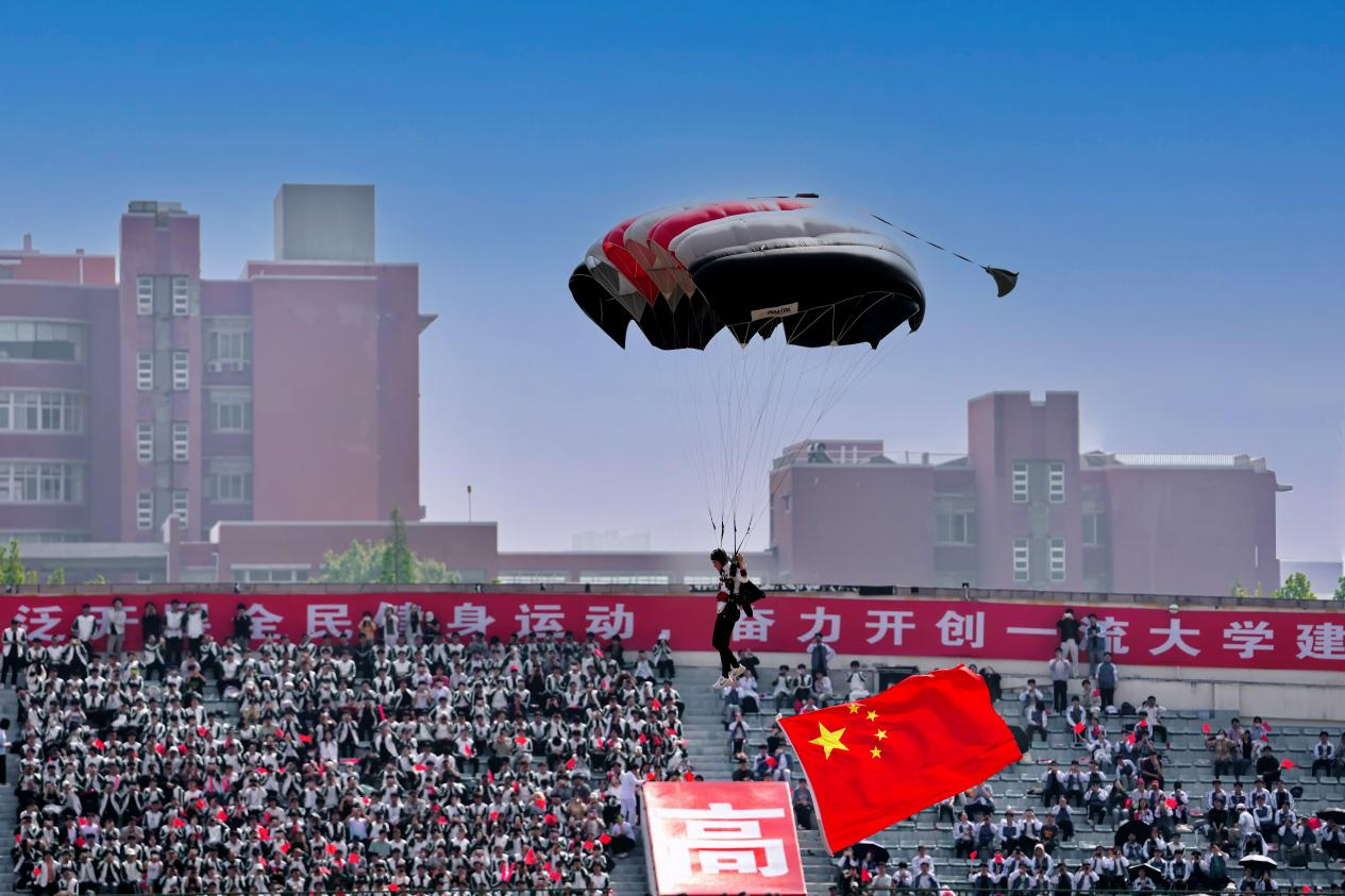 随风而动的主伞盖宛如斑斓飘逸的彩云,飘荡于体育场上空。“同学们,请看!”万众瞩目之中,10名来自河南跳伞队的运动员分批依次“从天而降”。万众期待中,两名跳伞次数超过6000次的世界冠军从1000米的高度分别携国旗与校旗跳下,国旗在空中迎风飘扬,耀眼夺目;紧随其后的校旗在湛蓝的天空中缓缓展开,同样闪耀。两面旗帜在本源体育场上空飘摇,祝福祖国繁荣昌盛、人民幸福安康,也祝福必赢76net线路官网事业蒸蒸日上、桃李满天下。