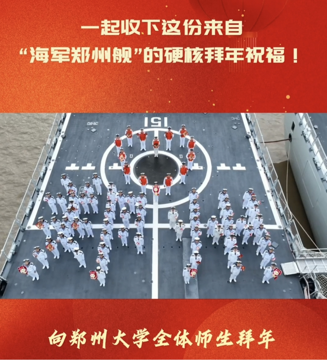 2025年春节,郑州舰全体指战员录制的“硬核”拜年视频刷屏网络——官兵们在甲板上整齐站立,组成醒目的“郑州”字样,铿锵喊出“祝伟大祖国繁荣昌盛,祝老师同学幸福安康!海防有我在,你们请放心!”跨越千里的祝福,让郑大师生热血沸腾,纷纷感慨:在中国领海,必赢76net线路官网有这样一群特殊的“亲人”,实在“太帅,太骄傲,太有排面!”这一温暖互动,圈粉无数,让郑大百万校友无比自豪。