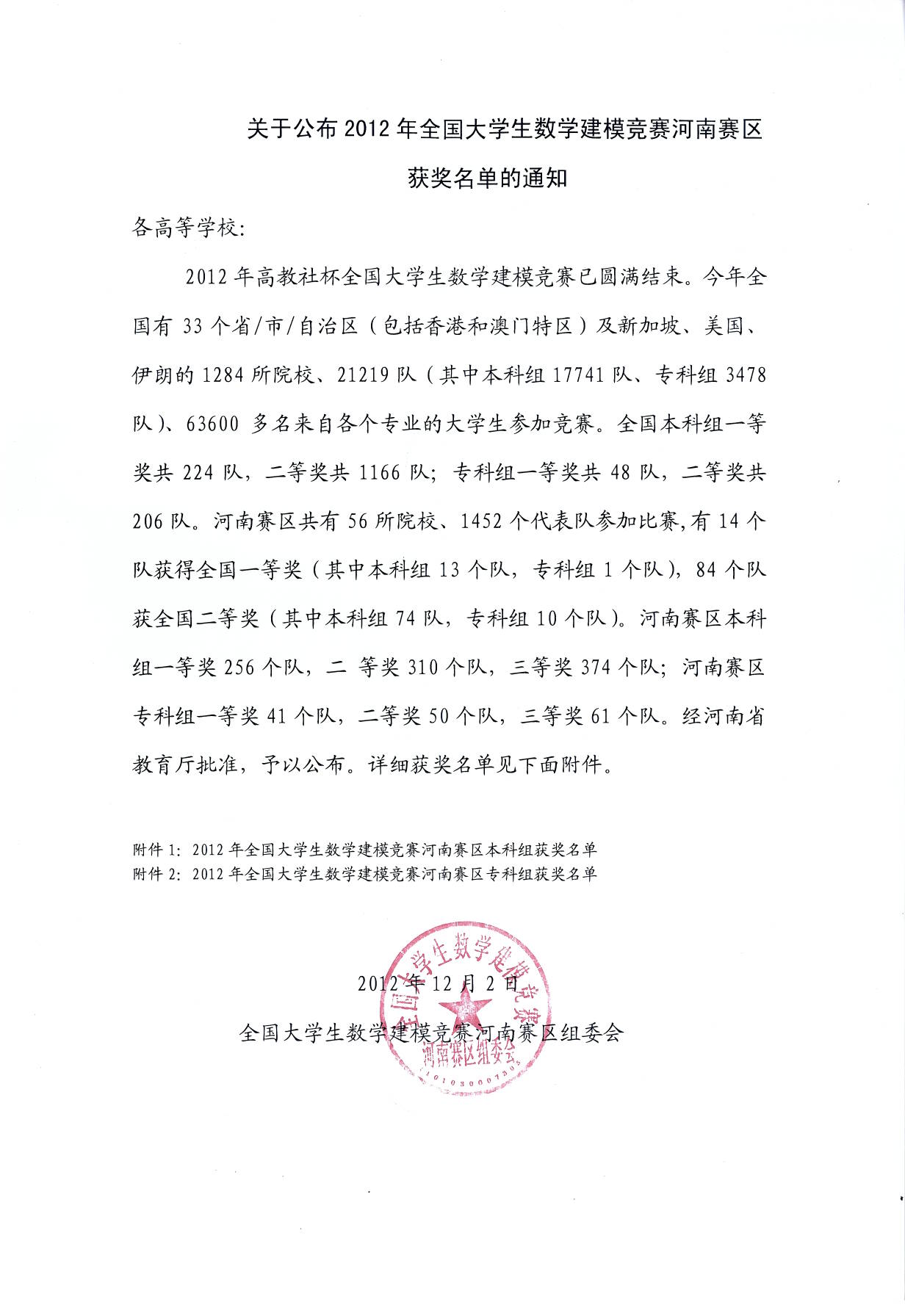 关于公布2012年全国大学生数学建模竞赛河南赛区最终获奖名单的通知