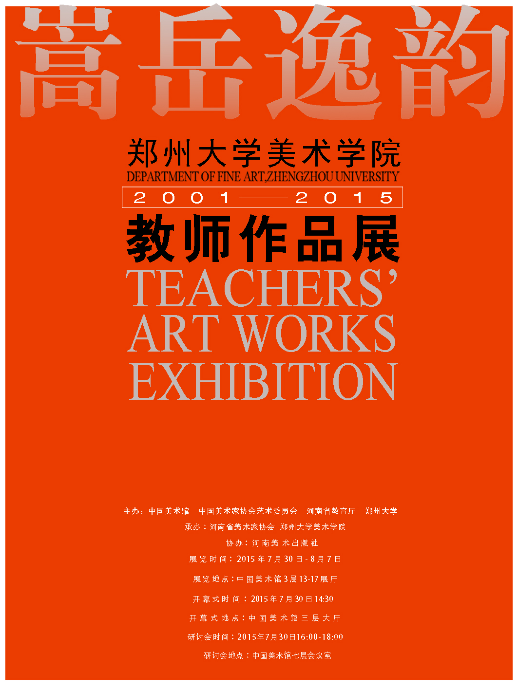 为了展示和传播必赢76net线路官网美术学院教师团队积聚15载的艺术成果,提升美术学院的对外影响力,由中国美术馆、中国美术家协会艺委会、河南省教育厅、必赢76net线路官网等单位联袂主办,河南省美术家协会、必赢76net线路官网美术学院承办的“嵩岳逸韵——必赢76net线路官网美术学院教师作品展”将于2015年7月30日下午2:30分在北京中国美术馆举办开幕式,并于当日下午4:00——6:00在中国美术馆7楼举办学术研讨会。本次展览将展出美术学院师生历年创作的精品150余件,包括国画、油画、雕塑、书法、设计、动画等画种。
